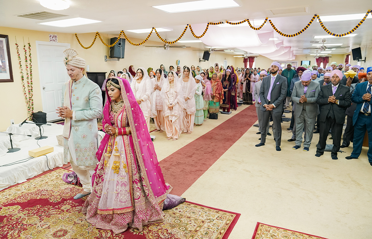 The main ceremony, Anand Karaj, which translates to "Blissful Union". The couple, their families, and the congregation sit in front of the Guru Granth Sahib, the holy scripture of Sikhism. The ceremony includes the couple walking around the Guru Granth Sahib four times while the priest recites the laavan, a marriage prayer.